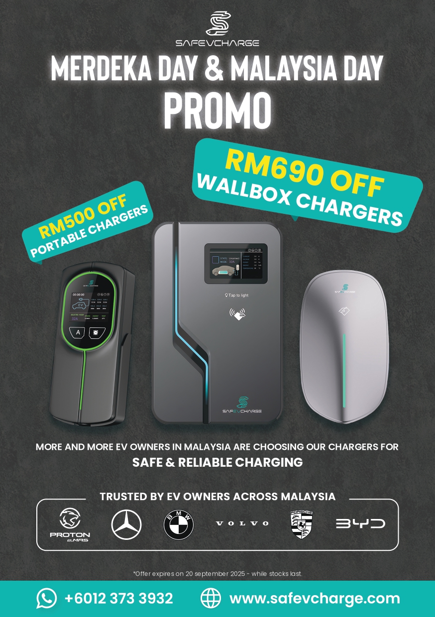 Enjoy RM500 off Portable Chargers and RM690 off Wallbox Chargers. Offer valid until 20 September 2025 — while stocks last. Don’t miss this chance to upgrade your EV charging with SafevCharge, trusted by EV owners across Malaysia.